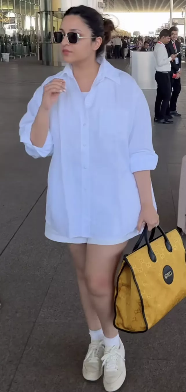Just lately, Parineeti was papped on the airport and seemed her finest. She wore an outsized white-hued shirt teamed with loose-fitted shorts. She styled her look with white socks, a pair of white footwear, and glasses. Parineeti stored her look delicate, with hair tied in a excessive bun. Her mustard-hued Gucci bag added the mandatory oomph to her look.