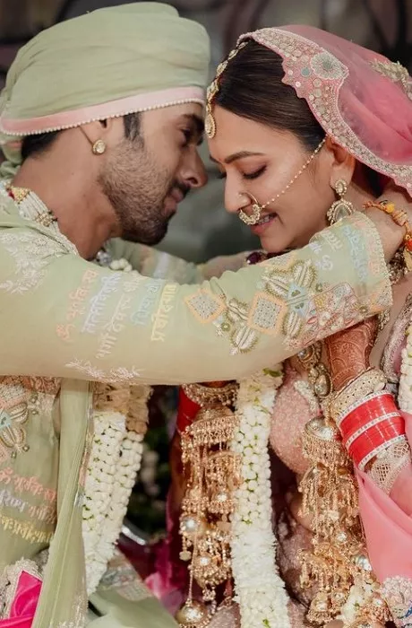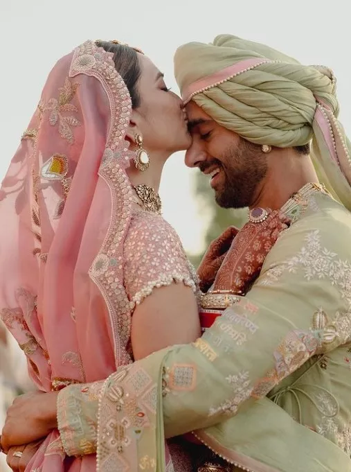 On March 16, 2024, Pulkit Samrat and Kriti Kharbanda dropped the much-awaited first glimpses of their marriage ceremony photos. Speaking in regards to the bride, Kriti regarded lovely in a child pink-hued lehenga, that includes heavy floral embroidery, zari and embellishment work throughout it. She paired it with an identical choli and draped a dupatta that includes scalloped borders. On the opposite hand, Pulkit regarded dapper in a mint green-hued sherwani with an identical dhoti. He wore turban and doshala in the identical hue, and regarded good-looking. Along with the photographs, the couple collectively penned a caption that learn as: