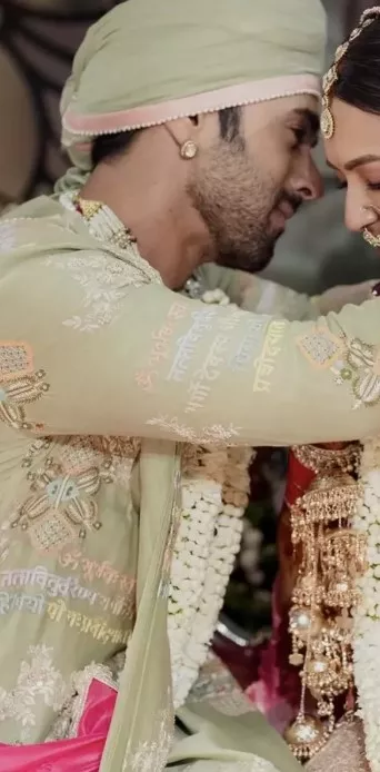 Pulkit Samrat’s customized marriage ceremony ensemble featured Gayatri Mantra inscribed on it
