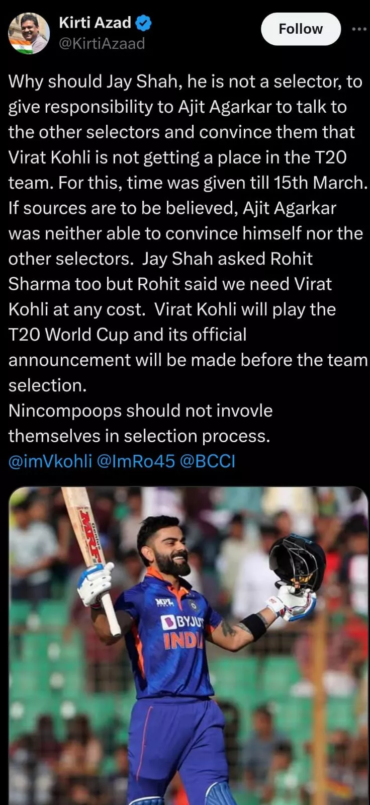 On the opposite hand, as per the most recent developments on this matter, cricketer-turned-politician Kirti Azad lately took to his X (beforehand Twitter) and acknowledged that the chief selector, Ajit Agarkar, was not in a position to persuade himself and different selectors that Virat is not going to be part of the crew in T-20 World Cup. As per Kirti Aazd, Jay Saha requested Rohit Sharma about the identical, and the latter mentioned they want Virat at any price for the T-20 World Cup, and the latter is a lot within the recreation. Check out the viral publish:
