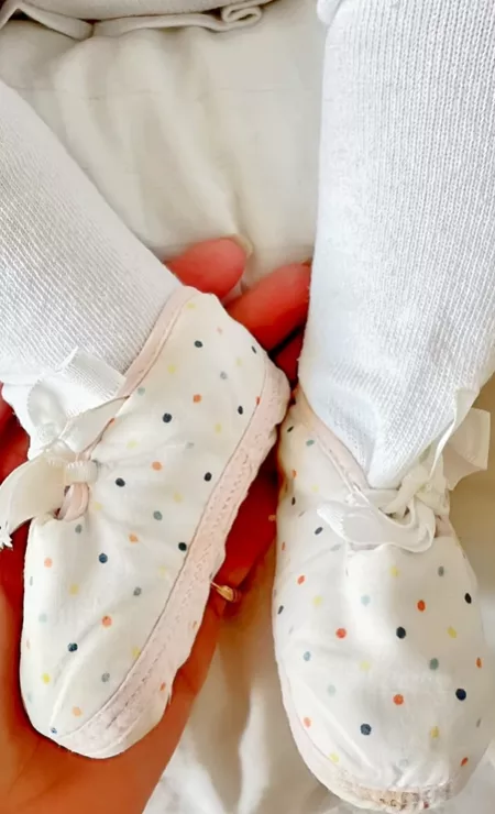 “Sharing a precious little glimpse from our life! P.S. The last weekend before Ramzan, when Aara met her entire family at home for aqiqa and wore my first shoes, my mother saved all these years!”