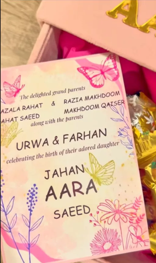 At the start of the video, the brand new dad and mom, Farhan and Urwa posed for the digicam whereas wanting misplaced in one another’s eyes. For the aqiqa ceremony of their little angel, the actress was carrying a chic floral-printed gharara set, and Farhan donned a white-hued kurta pyjama. Further within the video, the couple was additionally seen posing with just a few of their relations. Moreover, the reel additionally showcased the ornament of Farhan and Urwa’s dwelling, a field adorned with the identify of their child woman, and the mouthwatering dishes specifically made for the ceremony.