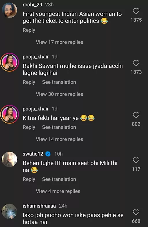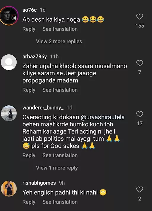 No sooner than the video surfaced online, netizens rushed to the comment section to express their views on Urvashi joining politics. While the majority of netizens bashed Urvashi for blowing her own whistle, others had a hilarious take on it. One user commented, “Ticket mili hai Dc ki match ki”, indicating towards her complex relationship with Indian cricketer, Rishabh Pant. Another user said, “Wo PVR ki ticket hogi”, while a third user said, “Abh desh ka kiya hoga”.
