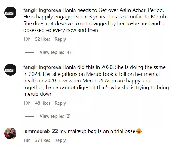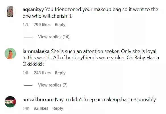 Galaxy Lollywood also posted Hania Aamir’s analogy on its official Instagram page, and netizens have been sharing their thoughts on the same. A section of the online community trolled her for not properly taking care of her relationship, others asked her to move on saying she deserves much better. While one user said, “Is she saying Meerub stole Asim?” another wrote, “You friend zoned your makeup bag, so it went to the one who will cherish it.” A third user commented, “Nay, you didn’t keep your makeup bag responsibly.”
