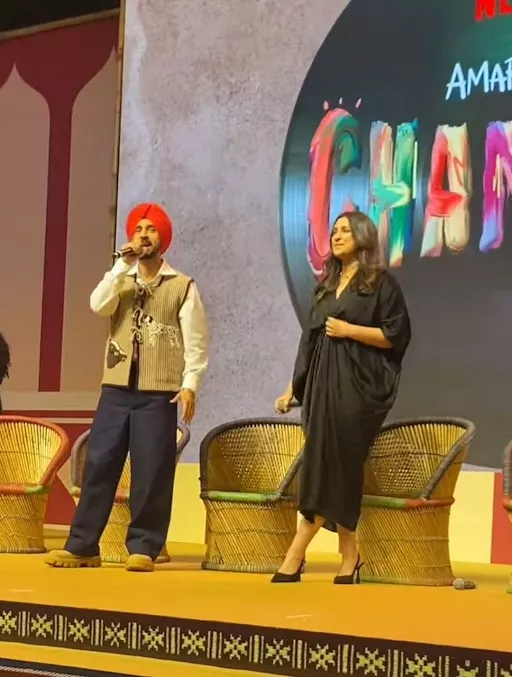 During the trailer launch, Diljit Dosanjh and Parineeti Chopra took center stage and mesmerised everyone with their melodious voices. For the event, Parineeti was decked in a black satin kaftan dress, which she accessorised with a dainty golden necklace and black pumps. Diljit, on the other hand, donned a white-hued shirt with a half-sleeved ivory sweater and black pants.