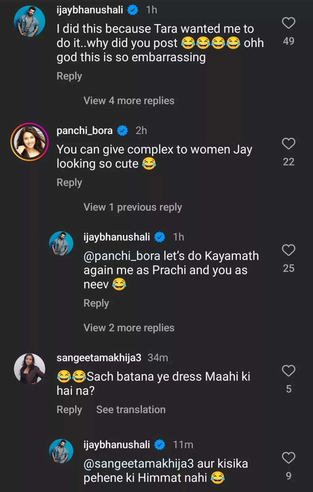 Soon after the video was posted online, Jay reacted to it. He penned, “I did this because Tara wanted me to do it..why did you post, ohh god this is so embarrassing.” Following this, many other netizens also started reacting to it. While one user commented, “Kya majboori rahi hogi jay bhai”, to which Jay replied, “Beti ka pyaar.” One more user mentioned, “You can give complex to women Jay looking so cute.”