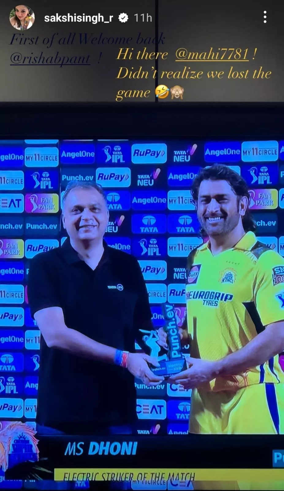 During the IPL 2024 match against Delhi Capitals, MS Dhoni ensured the crowd got the perfect entertainment through his pyrotechnics. Thus, after his team, Chennai Super Kings suffered their first defeat of the IPL 2024, his doting wife, Sakshi Dhoni penned a lovely note for him, the ‘Electric Striker of the Match’. She took to her Instagram story and admitted that she didn’t realise Delhi Capitals’ win. Sharing a picture of Dhoni receiving an award at the end of the match, she wrote: