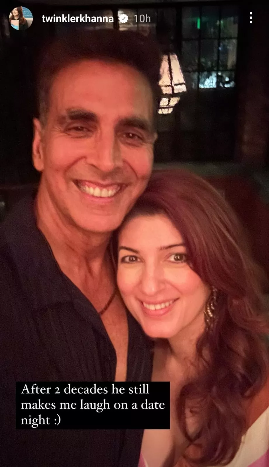 On April 2, 2024, Twinkle Khanna took to her IG stories and dropped a lovely picture featuring her alongside her husband, Akshay Kumar. The picture proves how they have kept the romance alive in their relationship by still going on date nights. In the picture, while Akshay looked handsome in a black kurta, Twinkle, who was seen resting her head on his chest, kept her look absolutely subtle. A certain glow was visible on their faces as they mushily clicked the picture. Sharing the photo, she wrote:
