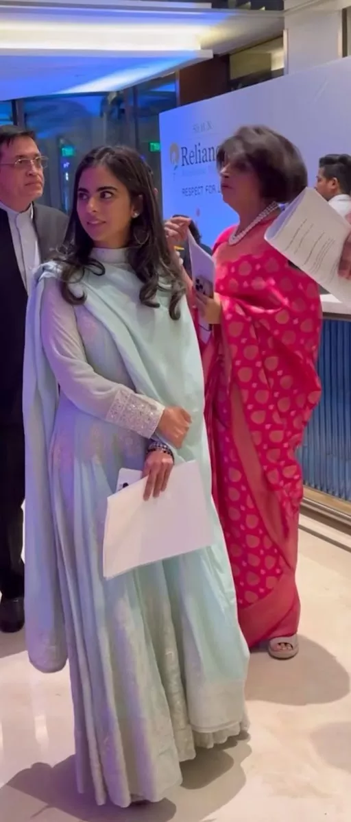 Isha Ambani is known for her impressive fashion statements and philanthropic endeavours. The diva stunned everyone on April 6, 2024, with her simple, chic, elegant sartorial pick. For the event, Isha was dressed in an aqua-blue anarkali with intricate zari work and a designed hemline. The suit featured full sleeves with a churidar, which she paired with a sheer dupatta in the same hue.