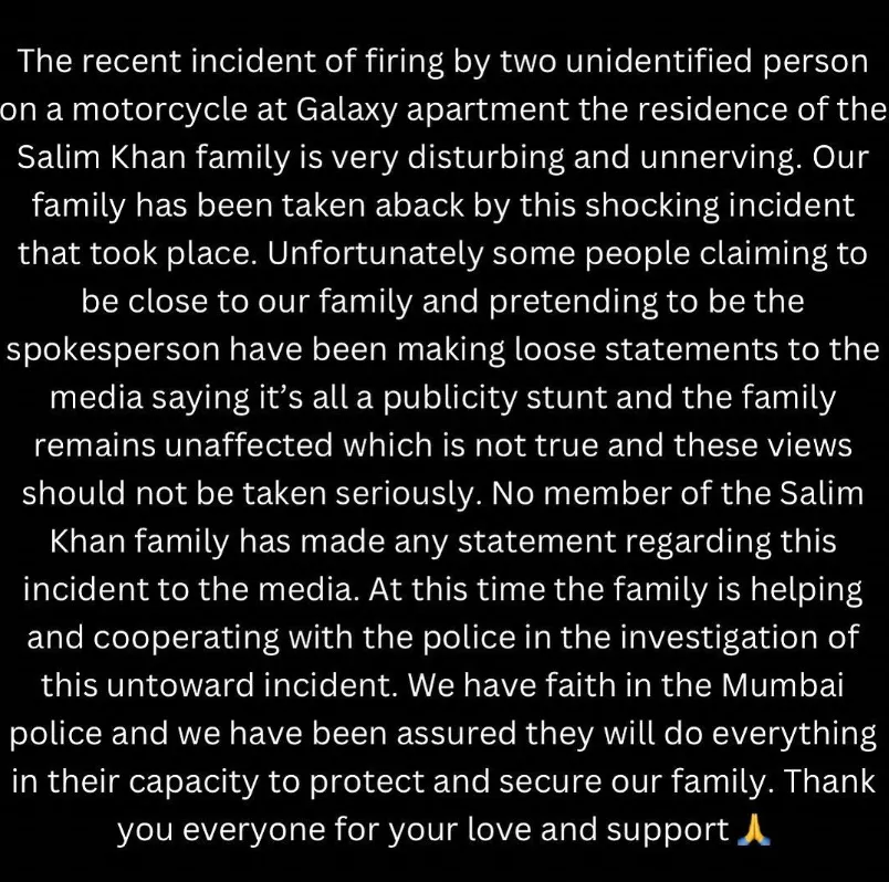 Meanwhile, Salman’s brother, Arbaaz Khan released a statement on behalf of the Khan family. The lengthy note mentioned that the entire family has been taken aback by this recent incident and stated that the claims made by the so-called spokesperson of the family should not be taken seriously. He added that the entire family is cooperating with the police in the investigation of this untoward incident.