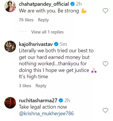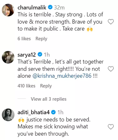As soon as she posted this on her Instagram, scores of people started showing support for her. Actress Shireen Mirza said, “I have seen u being patient and quiet, but not anymore, baby. I’m glad u spoke about it coz we need justice. Time to get some serious action!!! Stay strong.” Aditi Bhatia wrote, “Justice needs to be served. Makes me sick knowing what you’ve been through.” Shraddha Arya penned, “hat’s Terrible, let’s all get together and serve them right!!!! You’re not alone @krishna_mukherjee786 !!!”