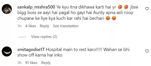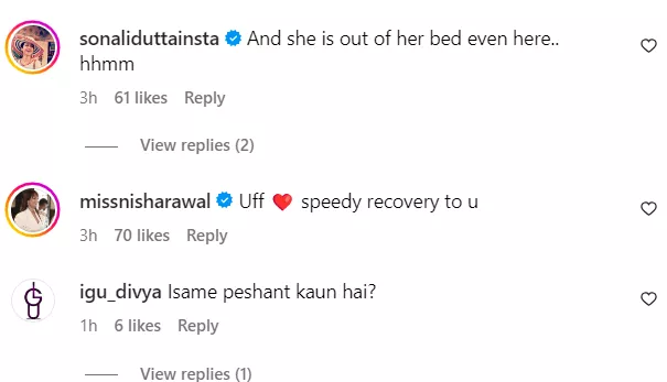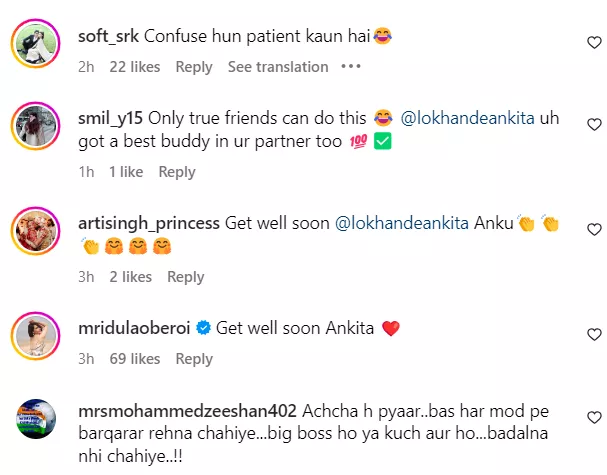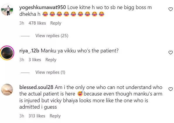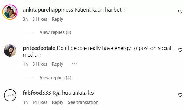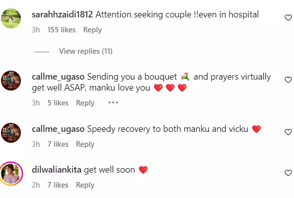 Soon after Ankita uploaded the pictures on social media, people started sharing their thoughts on them. While some sent prayers for the couple and wished them a speedy recovery, others were confused about who the patient was. One user said, “Confuse hun patient kaun hai.” Another one wrote, “Attention seeking couple!! even in hospital.” A third netizen mentioned, “Manku ya vikku who’s the patient?”