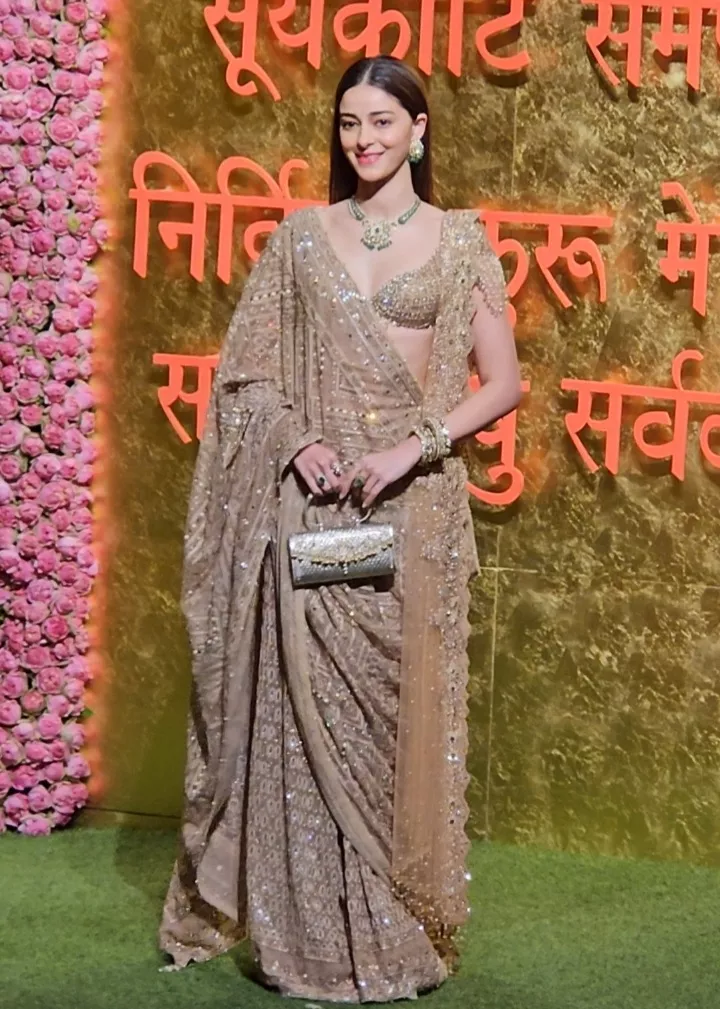 Ananya Ananya Panday looked stunning in a golden saree with embellishments. She draped it uniquely with a golden embellished blouse. The Dream Girl 2 actress completed her look with rings, a matching stack of bangles, statement neck piece and matching earrings. She kept her makeup simple with glossy pink lipstick.