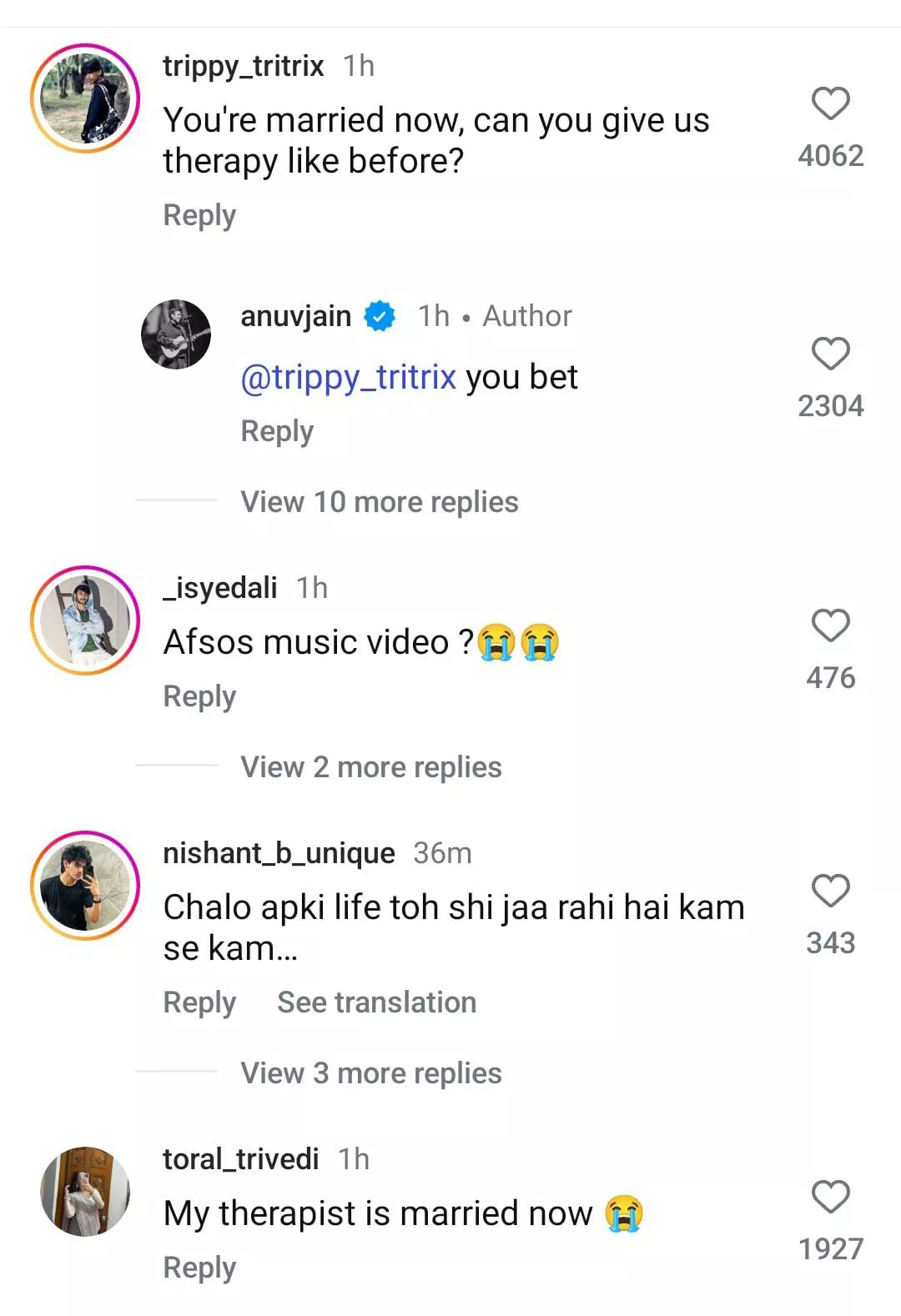 Anuv Jain who has always said that each song of his has a story and it is always around him. It is not clear if the 29-year-old singer had an intimate wedding ceremony, but his fans feel that they are not being able to move on with his happily ever after. One user wrote, “My therapist got married.” Another one wrote, “You’re married now, can you give us therapy like before?” Others found the pictures dreamy and stunning while a concerned user said, “Bhai abhi to or uski yaad dilane wale gane to nhi gaoge na.”
