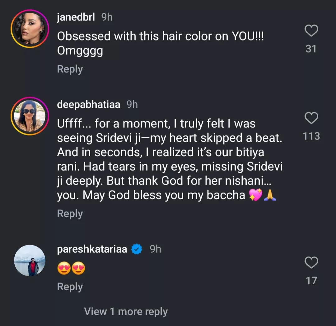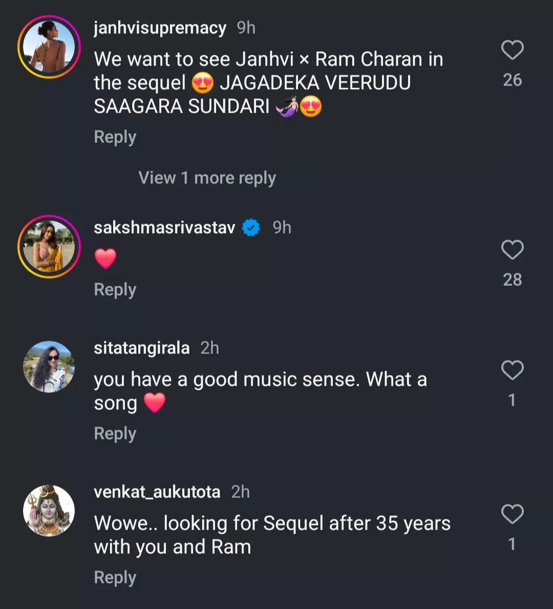 When Janhvi Kapoor shared her pictures in a custom denim jacket, netizens were overtaken by emotions for the late actress. They demanded the diva to star in Jagadeka Veerudu Athiloka Sundari‘s sequel with Chiranjeevi’s son, Ram Charan. One netizen penned, “We want to see Janhvi X Ram Charan in the sequel. Jagadeka Veerudu Athiloka Sundari.” Another user wrote, “Wow, looking for a sequel after 35 years with you and Ram.” A fan who admired Janhvi’s love for her late mom and commented, “If for a moment, I truly felt I was seeing Sridevi Ji, my heart skipped a beat. And in seconds, I realised it was our bitiya, Rani. I had tears in my eyes, missing Sridevi Ji deeply. But thank you for her nishani. May God bless her.”